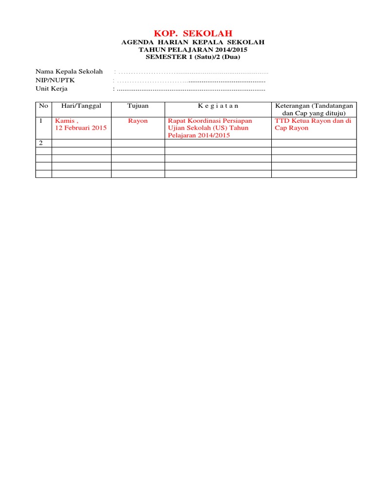Contoh Pengisian Jurnal Harian Kepala Sekolah Masnurul